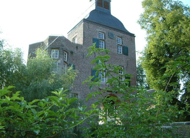 Als weiteres sehenswertes Schloss neben Liedberg findet man in Korschenbroich nahe der Stadtgrenze zu Mönchengladbach im Ortsteil Herrenshoff das Schloss Myllendonk. Die seit 1166 nachweisbaren Herren von Myllendonk besaßen unter den niederrheinischen Adelsgeschlechtern eine bedeutende Stellung, die sich in umfangreichen Besitzungen manifestierte. Bekanntester Sohn der Familie ist bis heute der Zisterziensermönch und Geschichtsschreiber Caesarius von Heisterbach (ca. 1180-1240). Als Ende des 13.Jh die Familie ausstarb, gelangte Myllendonk an die Herren von Reifferscheid und um 1346 durch Heirat an die von Mirlaer. Letztere benannten sich später nach ihrem neuen Stammsitz von Myllendonk. Von 1621 bis zur napoleonischen Besetzung war das Schloss in mehrfach wechselndem gräflichen und herzoglichen Besitz. 1700 erlangte die bis Ende des 13.Jh selbstständige Herrschaft Myllendonk ihre Reichsunmittelbarkeit zurück. 1803 kaufte Franz Gottfried von Maerckem die Anlage, die 1832 über dessen Nichte an die Familie von Wüllenweber ging, die seither das Schloss bewohnt und sorgsam pflegt. Unmittelbar am Ostufer der begradigten Niers liegt die weitläufige, von Wassergräben umgebene und mehrfach untergliederte Anlage. Sie wird erschlossen von der im Osten liegenden Zufahrt. Über drei Brücken gelangt man von der äußeren Vorburg auf die innere Vorburginsel, die 1263/64 dem Kölner Erzbischof Engelbert zu Lehen aufgetragen wurde, und schließlich in die Hauptburg. Zwischen dieser und dem westlichen Außengraben liegt eine vierte Burginsel, die gänzlich unbebaut als Nutzgarten diente. Myllendonk beeindruckt besonders durch seine hohen Backsteingebäude, die eher wahllos aneinander gefügt wirken und die baumbestandene Landschaft stolz überragen. Aufgrund seiner verschachtelten Silhouette entspricht Myllendonk dem malerisch-romantischen Bild einer trutzigen Wasserburg. Ein 1559 datierter Wappenstein, der 1856 an die erneuerte Hoffront des Westturms versetzt wurde, deutet auf Um- und Erweiterungsbauten hin. Möglicherweise stammte er von dem neu errichteten Ostflügel, der auch die Zufahrt überspannte. Als 1591 Teile des gotischen Palas einstürzten, wurde dessen Hoffront vollständig erneuert und durch eine dekorative Renaissance-Loggia aufgewertet. Aus dem letzten Jahrzehnt des 16.Jh. stammen außerdem alle Dächer und die laternenbekrönten Turmhauben. Gemäß einer Mauerankerdatierung wurden 1630 der sechsgeschossige Nordostturm und die Ostfassade des Seitenflügels zu einer barocken Schaufront umgestaltet. Die neu geschaffene Pracht, die von einem barocken Terrassengarten mit kleinem Pavillon abgerundet wurde, bestand allerdings nicht sehr lange : 1642 wurde das Schloss bei kriegerischen Auseinandersetzungen beschädigt. 1655 und 1671 von spanisch-geldrischen Truppen besetzt, die die angestrebte Loslösung aus dem Lehnsverband verhindern sollten. In diesem Zusammenhang wurde der Arkadengang vermauert und Mitte des 18. Jh. der Südteil des Ostflügels einschließlich der Tordurchfahrt abgebrochen.Dennoch hat sich bis heute eine imposante Anlage erhalten! Ralf Frommen, Marcus Wagener im August 2002 |